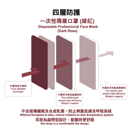 - 材質-四層口罩:(雙層)45g PP non-woven .(中層)25g Meltblown non-woven. (最內層)25g PP non-woven