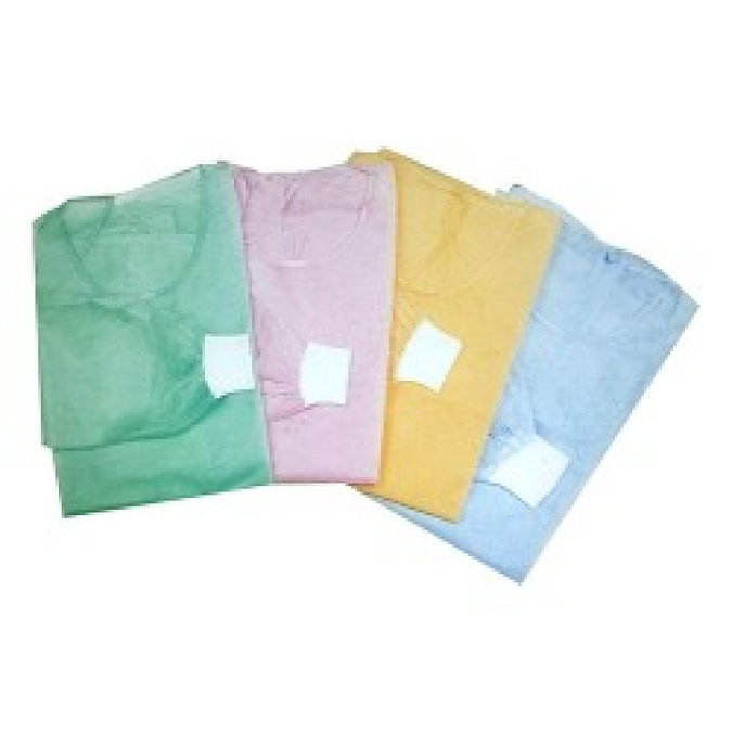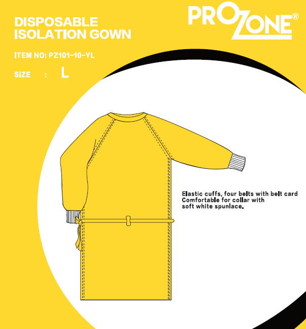 顏色:黃色 包裝 : 10件/包, 100件/箱 材料:SMS 重量:25gsm的優質無紡布 用法:一次性使用 袖口 : 白色羅紋袖 符合 AAMI PB70 1 級測試